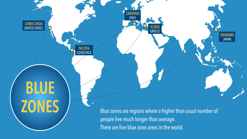 The Blue Zones are five areas of the world where longevity rates are longer than the average human lifespan. Those areas are: